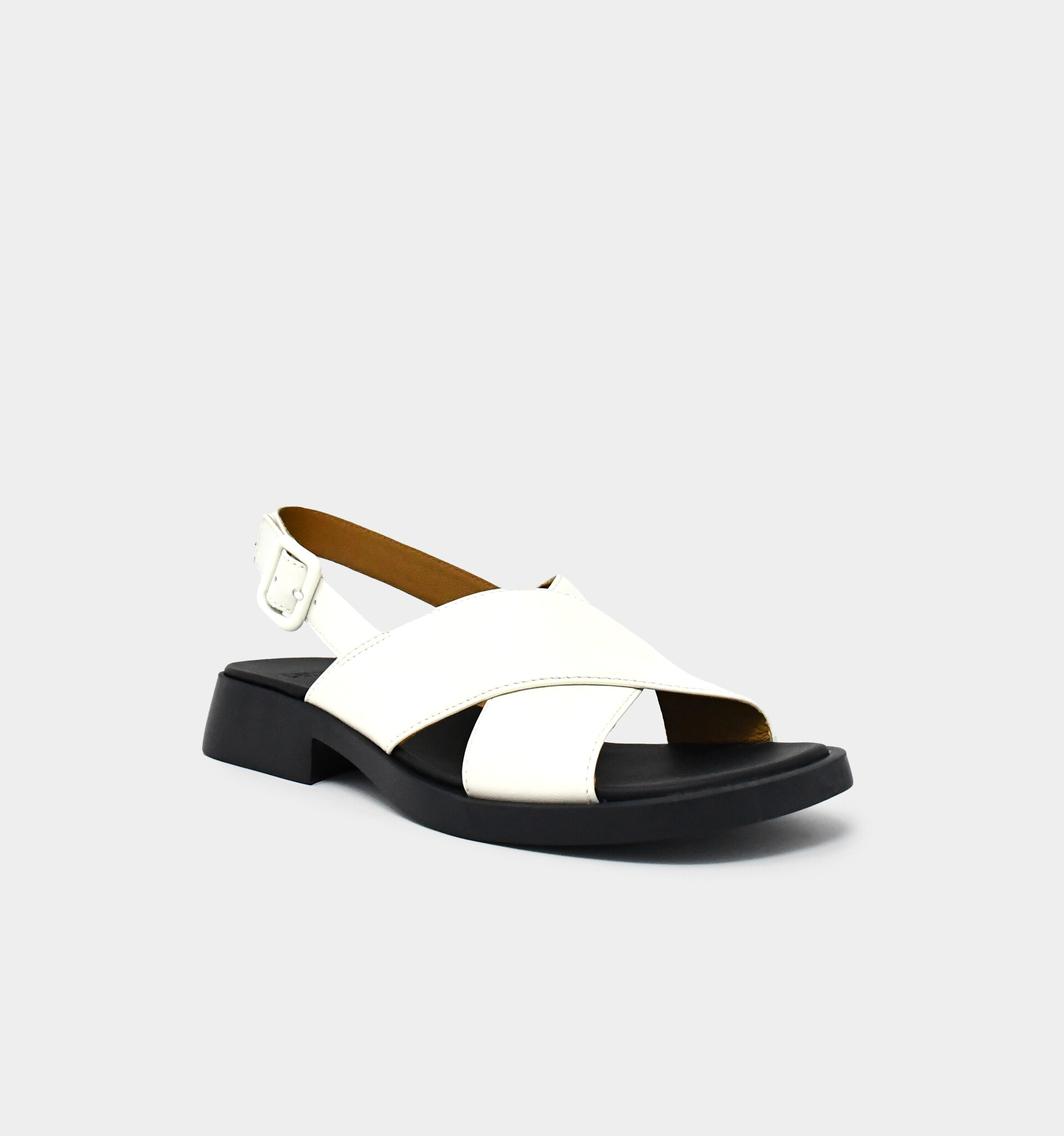 Camper's tried and true Dana sole, updated with a comfortable yet flattering X-strap and secured with with a buckle behind the ankle.