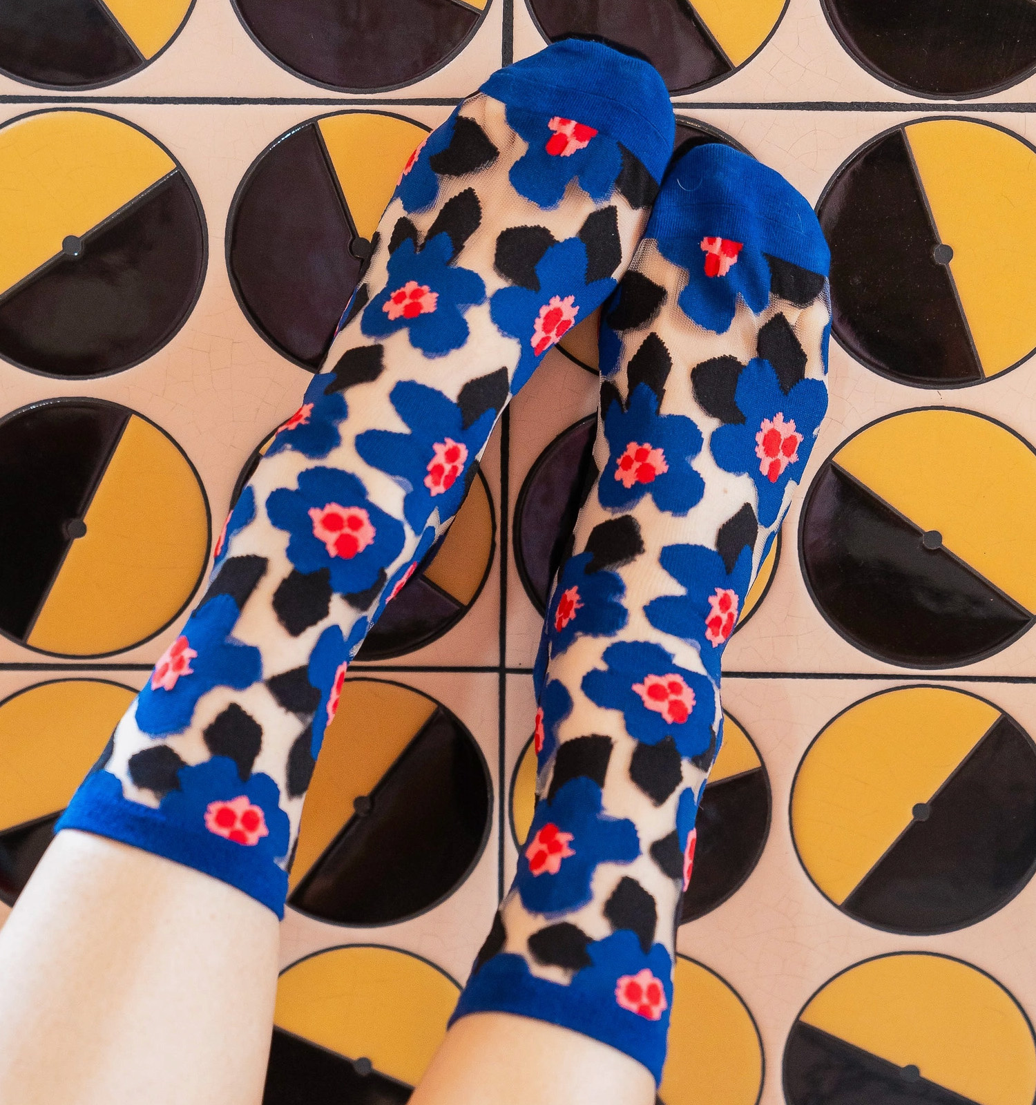Geometric style blue florals with unexpected elements of red, pink and black accents give Sock Candy's bold blue floral sock a distinctively edgy vibe.
