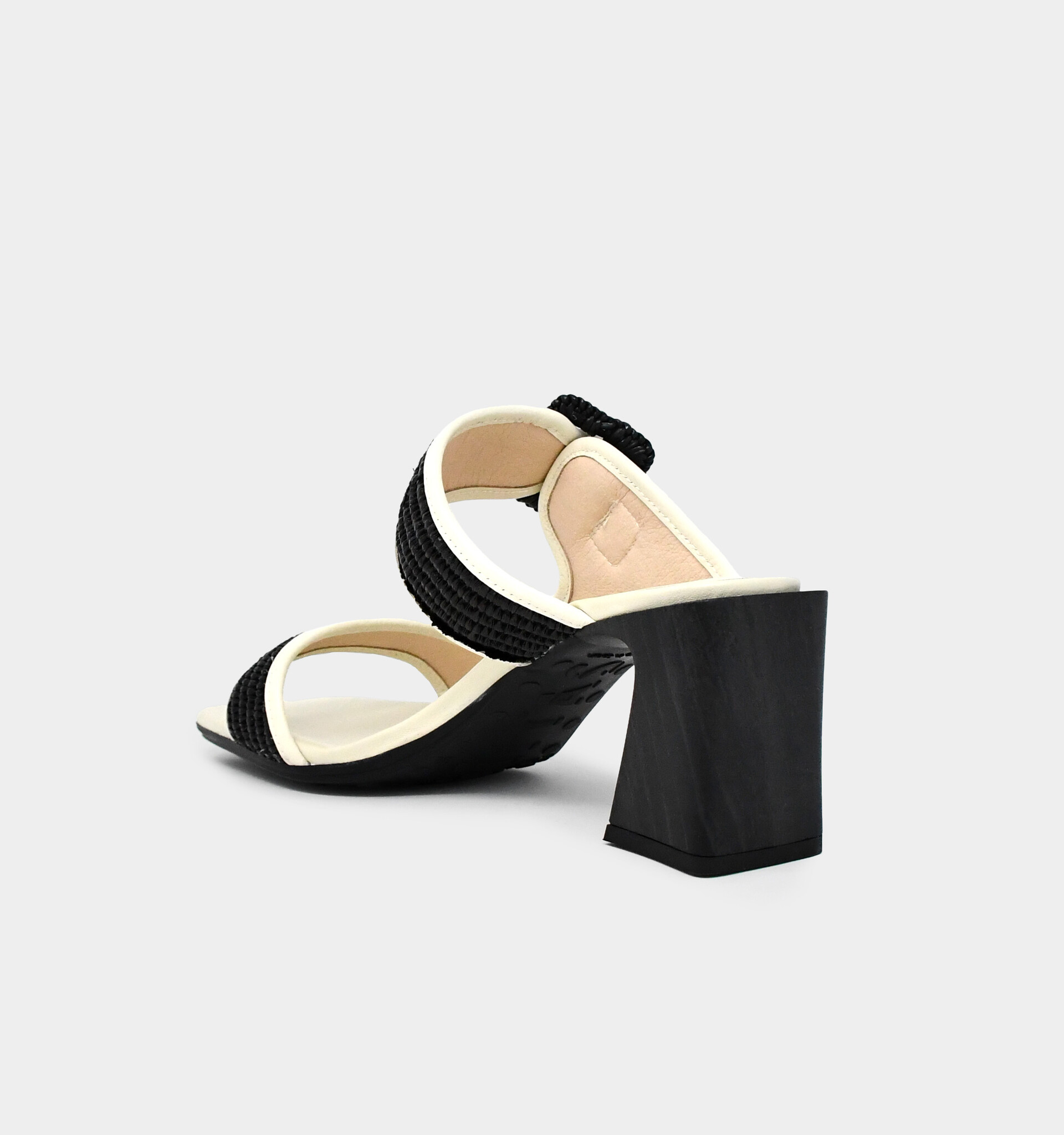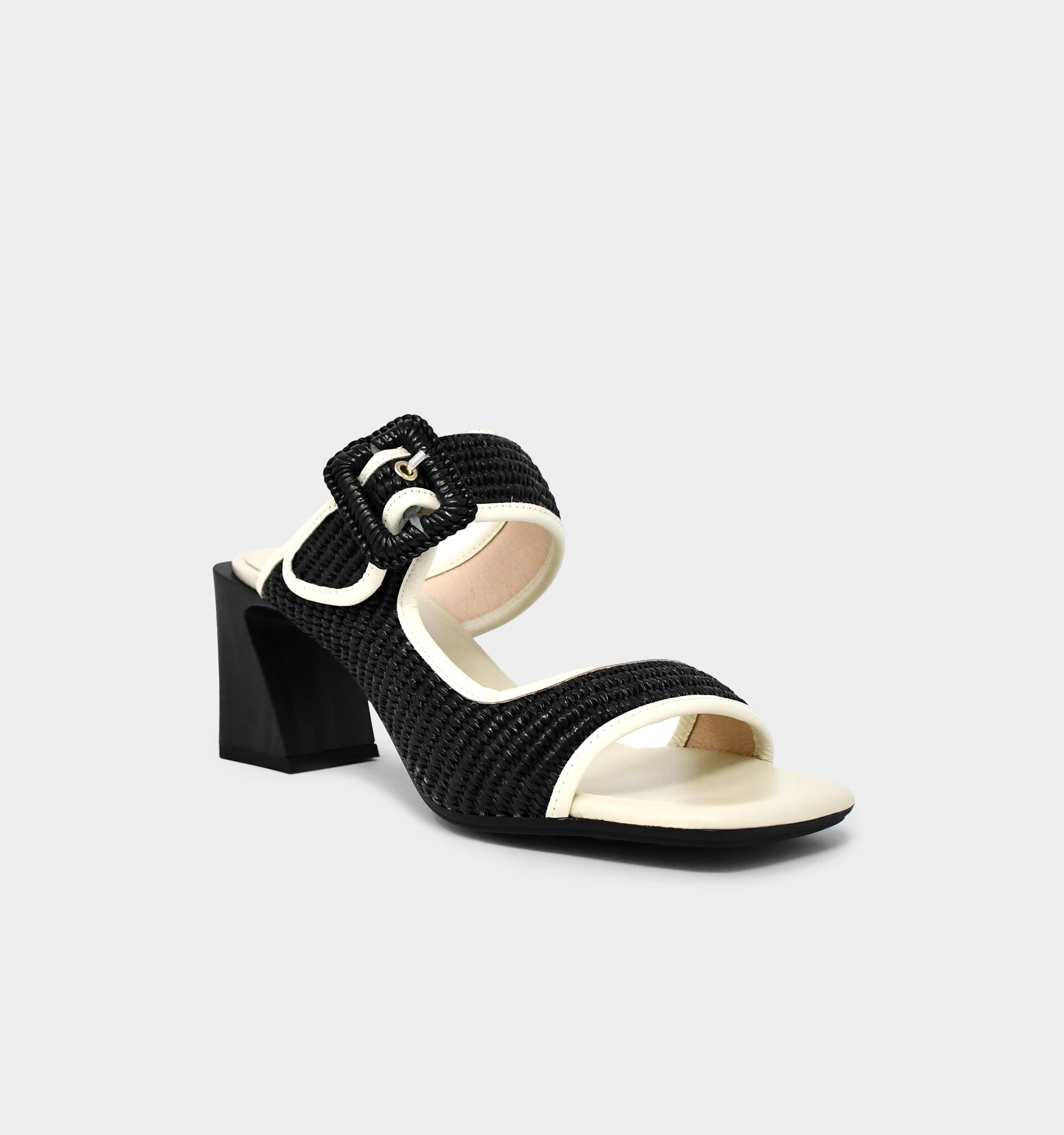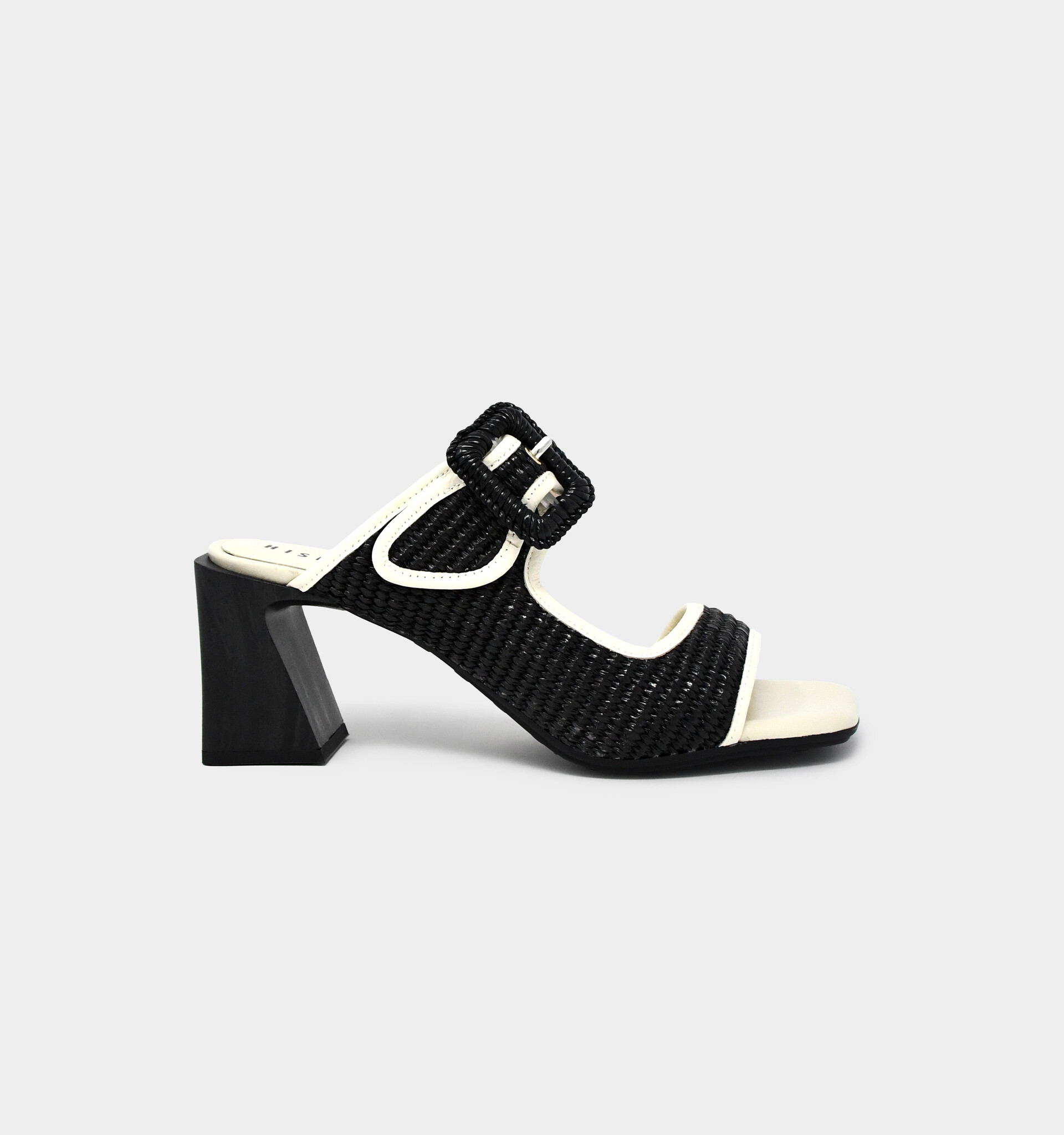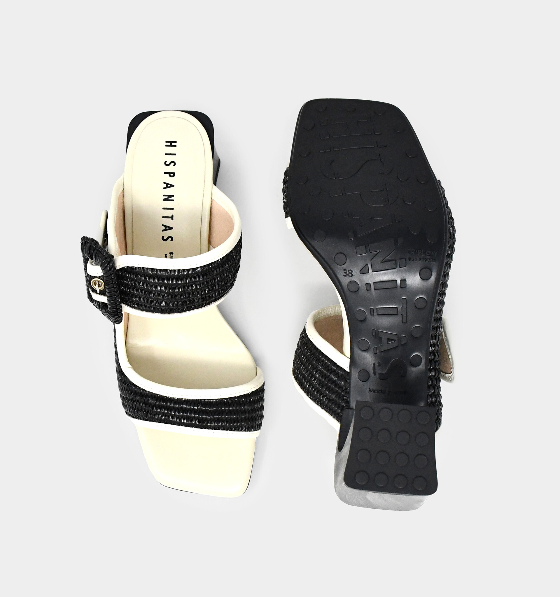 This geometric heeled mule by Hispanitas playfully combines leather and rattan. A rubber outsole and functional rattan-wrapped buckle make this style as practical as it is stylish.